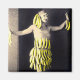 Foto colorida de uma jovem num vestido e acessórios feitos de bananas amarelas