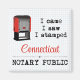 Eu Vim, Vi, Esmurrei. Anuncie seu negócio notarial de Connecticut com um toque de humor. O botão do orgulho do Estado faz um presente ponderado para qualquer notário profissional ou agente assinante de empréstimos que forneça serviços legais ao público. Este design de selo notário vermelho é apresentado sobre um fundo de papel de gráfico azul.
