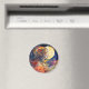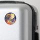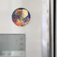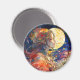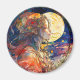 Um ímã redondo vibrante com uma pintura aquosa de uma garota e lua.