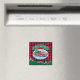 Este ímã de férias apresenta um caminhão vermelho vintage carregando uma árvore de natal fresca no fundo ou xadrez de búfalo vermelha e negra. Acima do caminhão, em uma faixa verde, lê-se "Feliz Natal".