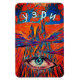 Montanhas de fantasia coloridas, nuvens e rosas. Um olho com um símbolo espiral. Você pode mudar o texto. Arte de Alexandra Cook aka Linandara.