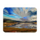Uma design de arte de um lago com o dramático céu refletido na água do lago. Colinas e campos circundam o lago.