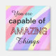 Uma mensagem colorida de motivação para mostrar na sua geladeira com as palavras inspiradoras Você É Capaz de Coisas Incríveis sobre um fundo de faixa diagonal de padrão arco-íris em lilás, coral, amarelo, azul e branco.