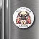 Um lindo desenho animado de chibi, acolhendo um filhote de cachorrinho sentado em um ímã de flores rosa.