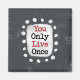O texto em negrito que lê "Você só vive uma vez" está centrado em um fundo de cinza. O texto preto se senta em um retângulo branco com grandes pontos brancos texturizados ao seu redor, fornecendo um contraste lúcido contra o plano de fundo de cor sólida.