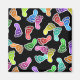 Ilustração de muitas pegadas coloridas com rostos sorridentes felizes pisando em um fundo preto. Imagem disponível em vários presentes e produtos.