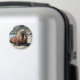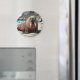 Walrus themed magnet with a cute walrus laying on a sandy beach by the ocean on a sunny day. Background of cliffs and blue ocean waves.