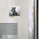 A soft watercolor-style illustration of a calm schnauzer seated among delicate blue wildflowers and meadow grasses, featuring gentle textures, a light neutral background, and a peaceful, natural atmosphere.