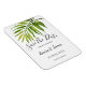 Casamento tropical e botânico Salve o ímã Data que apresenta uma folha de palmeira verde-aquarela e sotaques elegantes de caligrafia. Personalize com seus nomes, data do casamento e local.