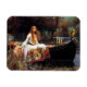 John William Waterhouse A Senhora de Shalott. Pintura a óleo na canvas de 1888. A Senhora de Shalott é uma bela pintura Pré-Raphaelita de uma cena do poema de Alfred Lord Tennyson com o mesmo nome. A pintura retrata a condenada Lady of Shalott velejando em direção a Camelot em um pequeno barco embebido com uma bela tapeçaria vermelha que ela chorou enquanto se apaixonava por Lancelot. No barco sentam três velas e um crucifixo do qual a menina olha para o lado. A própria senhora está vestida num vestido medieval azul e fluente bordado com ouro. O cabelo dela é uma auburn leve e ela segura a corrente do barco enquanto ela se prende para longe da doca, dentro das sementes, e as almofadas de lírios para além. Um presente de excelente para fãs de John William Waterhouse, os Pré-Raphaelites, a pintura romântica em inglês e a Legenda Arthuriana.