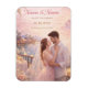 A romantic 'Save the Date' invitation featuring a charming animated couple [Name] and [Name] in a luxurious island resort setting, pastel colors, soft lighting, high-resolution aesthetic