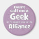 Não me chame de Geek ou eu te informarei à Aliança. Que as pessoas à sua volta saibam em que é que se meteram e que estão prontas a defendê-la.