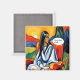 A woman in a white and blue dress sits on an orange chair within a landscape of vibrant hills and a bright sun, wondering 'What's that smell!'