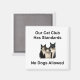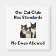 Imagem quadrada de 2 polegadas com "Nosso clube de gatos tem padrões - não são permitidos cachorros", que é divertida e humorística. É um design relâmpago — perfeito para amantes de gatos que apreciam um pouco sarcástico, humor de "regras de gatos, cães babam".