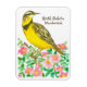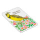 Um ímã decorado com uma larva amarela amarela amarela de pata-rosa brilhante num arbusto rosa selvagem, ilustrado com tinta e aquarela. Inspirado pelo pássaro e flor estadual da Dakota do Norte.
