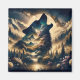 Imagem dentro de uma fotografia. Um lobo uivando na lua com montanhas e fundo florestal.
