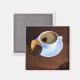 Uma ilustração de "ter uma pausa" com uma xícara branca de café - o café com forma cardíaca feito de espuma, 2 pedaços de chocolate zwieback rusk e alguns grãos de café em fundo de madeira.