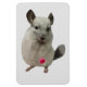 Chinchila branco mosaico em pé com as patas dianteiras segurando a boca em choque enquanto a xícara de chá rosa cai. Chinchilla caindo teacup.