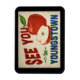 Um encantador ímã geladeira de viagens vintage de Ohio, de Youngstown, com uma linda maçã vermelha, junto com um texto divertido no estilo retrô que diz: "Até em Youngstown"