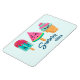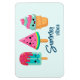 Magnet com uma ilustração de 3 tratamentos de sorvete diferentes. Um picolé azul-esverdeado com gotas de morango e salpicadores coloridos. Um picolé de melancia. Um cone com camadas deliciosas de sorvete em rosa e menta. Todos com sorrisos kawaii fofos.