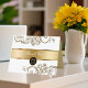 Cartões de agradecimentos imobiliário de escala superior com emblema de casa com aparência metálica simulada e elementos de design floral de ouro e branco na frente e as palavras de obrigados que você pode personalizar para suas necessidades. Projetado para enviar obrigados e uma demonstração de apreço para seus clientes, proprietários domésticos ou funcionarios de vendas e escritórios. Melhor usado para temas relacionados a agentes imobiliários, agências ou corretores que valorizam seus clientes.