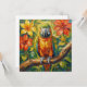 Um cartão em branco doce para dizer olá e manter contato com amigos ou familiares. Na frente está um papagaio em estilo de pintura impasto e flores tropicais.