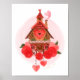 Rosas vermelhas adoram um encantador relógio de madeira com sotaques em forma de coração. Ilustração original de Noël Snow.