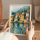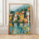 Traga um charme europeu vibrante para a sua casa com este impressão de arte caprichosa que apresenta uma aldeia colorida ao lado do lago aninhada entre árvores de ciprestes e flores silvestres. Com edifícios aquecidos de amarelo e terracota refletidos em águas tranquilas azuis, esta cena evoca o romance da costa italiana ou uma fuga pacífica do Mediterrâneo. Perfeito para amantes de viagem, torcedores de cottagecore, ou qualquer pessoa que deseje uma alegre explosão de cor floral e serenidade cênica em suas paredes.