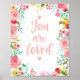 Linda impressão de arte de berçário "Você é amado" com flores cor-de-rosa e pêssego.