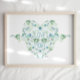 Lindos chapins em tons suaves azuis e verdes em um coração cheio de flores com as palavras "Ame Mais" da Jenn Steffen Art para Studio Posies. Ótima decoração para quarto de crianças ou berçário.