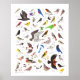 Desenhos pintados à mão de aves que vivem na baía de São Francisco, de pinheiros siskins a falcões peregrinos, com penas penciladas espalhadas sobre fundo branco.