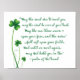 Design de tipografia caligráfica em verde com destaque de shamrock na borda esquerda mostra palavras desta bênção irlandesa: "Que a estrada se eleve para te conhecer, que o vento esteja nas suas costas. Que o sol brilhe quente sobre seu rosto, e as chuvas caem suaves sobre seus campos. E até nos encontrarmos de novo, que Deus vos segure na palma da mão Dele."