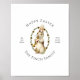 Uma design festiva com uma saudação personalizada ao lado do trabalho de arte de colheita de flores de primavera e de um coelho tocando um instrumento.
