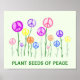 Uma design colorida de símbolo de paz "flores" crescendo em um jardim, com a mensagem "Plantar sementes de paz". Se querem ajudar a promover a paz no mundo, mostrem-no como um lembrete gentil para todos nós que atuamos de forma a fomentar a paz.