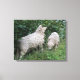 Esta incrível tela gráfica mostra uma fotografia de um par de ovelhas fofinhas e fofinhas. As ovelhas estão cercadas por flores silvestres e erva comprida e estão paradas debaixo de uma árvore e chegando, comendo algumas folhas de forma cinzenta. Eles têm casacos grossas de lã e rostos muito bonitos.