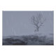 Uma paisagem 3D fria e ventosa no inverno, criada em Vue. Em cima de uma colina branca com gelo e neve, contra um céu de cinza tempestuoso com chuva ou manga caindo firmemente, uma árvore de bordo solitária e nua se posiciona com um banco de madeira embaixo dela.