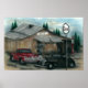 "Cody's Garage" é uma foto de uma estação de serviço antiga com chevy mais velho estacionado lá fora e dentro. O design original foi feito em lápis, aquarela e escova de ar.