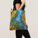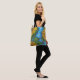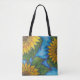 Bolsa o seu estilo com um saco de corpo de impressão de girassol bonito ou bolsa de ombro com grandes girassóis amarelos e folhas verdes sobre um fundo azul. Trabalho de arte de lápis de cor original pelo empate dotado.