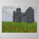 Uma cena 3D criou em Vue, mostrando o local de uma batalha antiga, com apenas as ruínas desmoronantes de uma torre de pedra medieval e flores vermelhas na grama para comemorar. A chuva em queda e o efeito de aquarela macia aumentam a tristeza da cena do topo da colina.