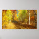 Um caminho supercrescido que percorre a floresta de pássaros em um dia ensolarado de outono. Os troncos preto e branco das árvores contrastam com folhas e gramíneas em todos os tons de ouro, de amarelo pálido a laranja profundo, iluminados pelos raios solares que passam pelos galhos.
