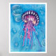 Pintura de aquarela original de Sandra Gale, com um grande peixe-geleia roxo ou Medusa (macho) com longos tendões flutuantes que flutuam entre as bolhas no mar profundo. design de excelente para qualquer um que ama criaturas marinhas e os lugares profundos dos nossos oceanos. Faz um presente de excelente para mergulhadores, surfistas, moradores de praia ou conservacionistas da natureza também!