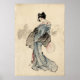 Mulher, retrato do comprimento do cheio, de pé, virada para a esquerda, segurando um ventilador na mão direita, vestindo quimono com cheque design. Katsushika, Hokusai