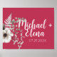 A placa de casamento moderna apresenta tons brancos/neutros de aquarela canto floral sobre fundo magenta com blocos de texto personalizáveis brancos em fontes modernas
