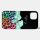 Capa de iPhone fashion feita em preto, na parte superior e uma impressão de onça malhada colorida, na parte inferior. Gráficos de uma fita e laço em hortelã, com um acento de diamante, decoram o meio da capa. Personalize o texto em hortelã para você ou como uma ideia de presente perfeita.
