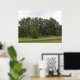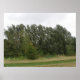 Esta bela impressão mostra uma fotografia de uma linha de árvores e a borda de alguns prados. A foto foi tirada na Grã-Bretanha em uma reserva natural. As árvores parecem estar se inclinando para um lado.