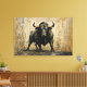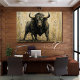 Um impressão de arte a aquarela acrílica ousada de um poderoso touro negro em pé no chão, pintado em tons quentes de ouro. Imagem perfeita para salas de estar, escritórios ou decoração de inspiração ocidental.
