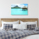 Tela paisagística impressa de um luxo luxuoso resort de lua de mel sobre-água na lagoa azul tropical clara da ilha pacifica de Bora Bora, perto de Tahiti, na Polinésia Francesa.
