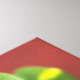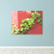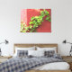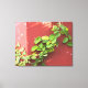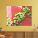 Uma vinha verde rasteja ao redor de uma parede colorida de coral e um canto. O contraste entre cores é estimulante. Miçangas de água podem ser vistas em algumas folhas.