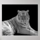 Bela fotografia de um tigre branco sobre fundo preto, com olhos verdes claros. Poster impressionante.