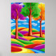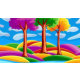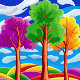 Três árvores com folhas de cores diferentes num campo colorido com céu azul e nuvens brancas, cores vibrantes, estilo de desenho animado, atmosfera alegre, balbuciosa, brilhante e lúdica.